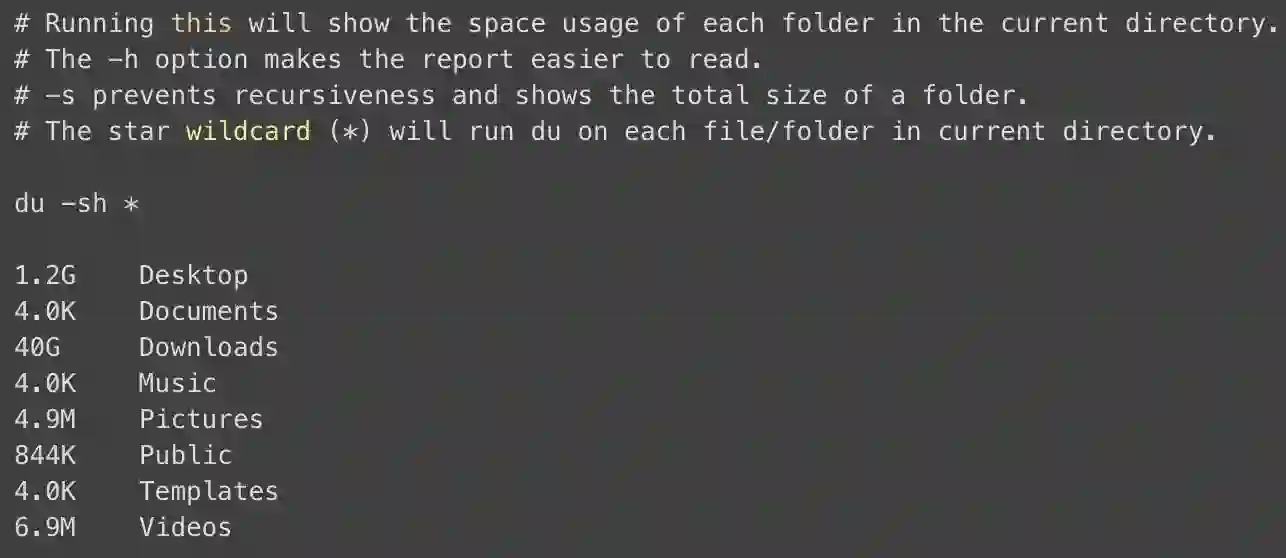 du 通常在你发现某个驱动器的空间不足,但不知道是因为什么造成的时候使用。使用此命令可以快速查看每个文件夹所占用的存储空间,从而把耗费存储的大户给找出来。