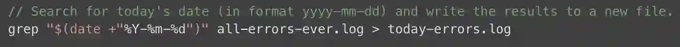 该命令在需要对大型文件进行内容过滤的时候非常趁手。下面我们利用 grep 结合 date 命令,来在一个大型的日志文件中进行查找,然后生成一个只包含当天错误日志的新文件。