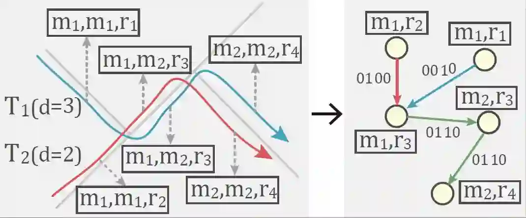 基于图结构的可达性索引建立过程。左图红、蓝两条轨迹的公共部分可以被压缩为右图图中绿色的边