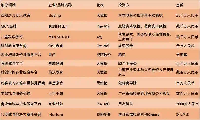 资本层面,本周获融资的教育企业不在少数。国内,职问宣布获得腾讯的战略融资,MCN品牌101名师工厂完成千万元Pre-A轮投资等;国外,印度教育科技企业iNurture获3亿卢比融资。