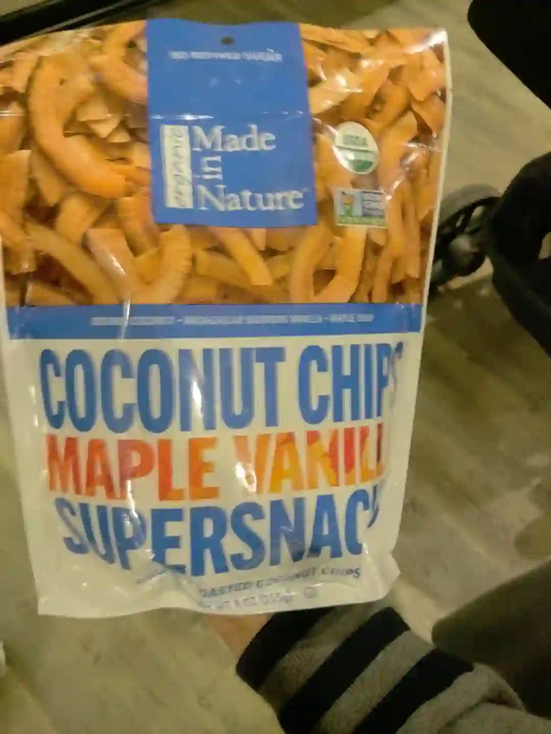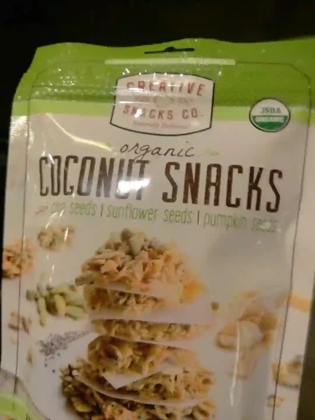图3:COCONUT SNRCKS(椰子点心),包装袋右上角有“USDA ORGANIC”标识,这是“农业部认证有机食品”。无“非转基因”标识。