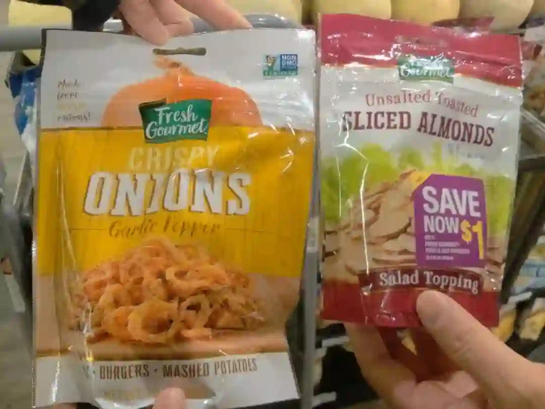 图4:左为ONIONS(洋葱圈),右上角有“NON GMO”( 非转基因)标识,标识全称为“非转基因项目组织认证的非转基因”;右为同一品牌的SLICED ALMONDS(杏片),却没有“非转基因”标识。这两种食品都没有“有机食品”标识。