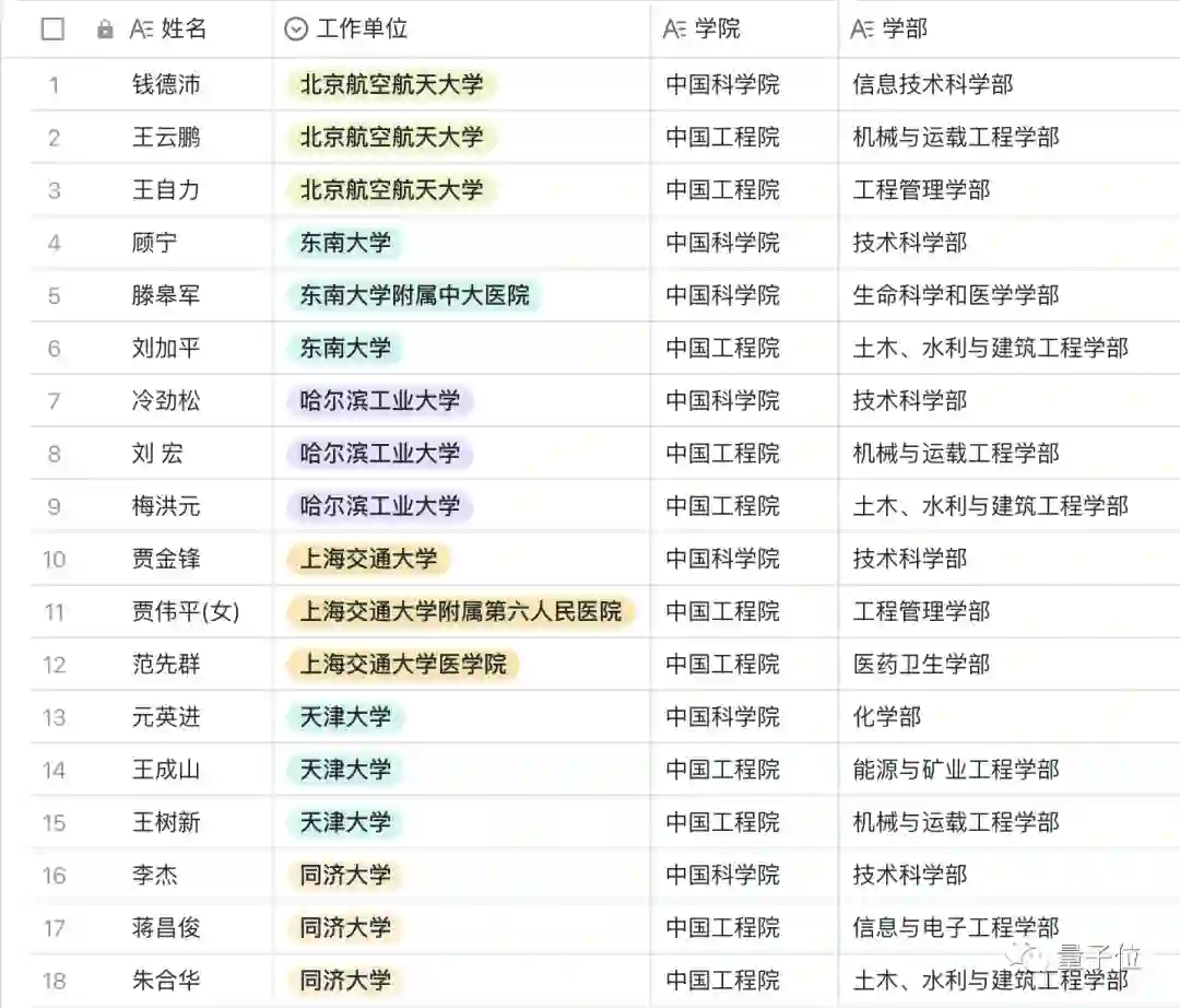北京航空航天大学、东南大学、哈尔滨工业大学、上海交通大学、天津大学、同济大学这6所高校各有3人当选: