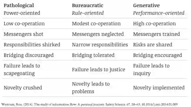 我们可以看看 Ron Westrum 在有关复杂组织中实现安全性的研究。在研究为什么有些组织比其他组织更安全时,他发现组织的文化可以预测其安全性。他确定了三种文化:病态的、官僚主义的和生产式的。他发现病态的可以预测其安全性较低,而生产式文化被预测为更安全(例如,在他的主要研究领域中,飞机坠毁或意外住院死亡的数量要少得多)。