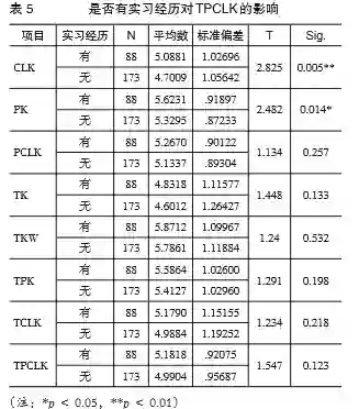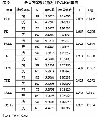 通过独立样本t检验分析,家教经历丰富程度影响他们的CLK和TCLK。这表明家教经历对职前教师的学科内容知识CLK及基于技术的学科内容知识TCLK有促进效果。