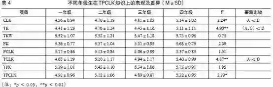 对本科一至四年级学生(分别用A、B、C、D来表示)的TPCLK知识进行ANOVA方差分析,见表4。表4反映出在CLK、TK、TCLK、TPCLK四个方面呈现出学业年级间的显著差异,但是事后Scheffe检验发现,TPCLK因子间没有体现出年级间的显著性差异