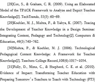 从框架应用价值来看,TPACK的研究逐渐从一般学科发展到特定学科。例如,段元美等(2015)发现初中数学教师TPACK包含5个因子,并用结构方程模型揭示了因子间关系。英语学科方面,王新新(2015)研究了TPACK框架下高校英语教师的微课设计能力,并提出了高校英语教师微课设计能力的应对策略。