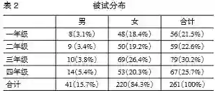 研究选北京师范大学汉语专业职前教师(师范生)作为研究对象,于2015年10月底展开网络调查,回收调查问卷269份,有效问卷261份,其中男生40人,女生221人,性别比例因师范学校特点而女生较多;此外一至四年级各有56、59、79、67人,数量较为均衡。