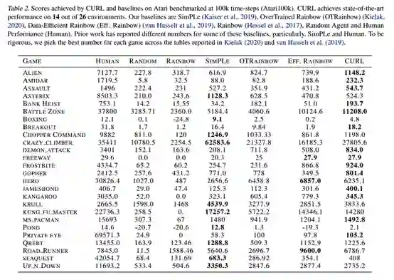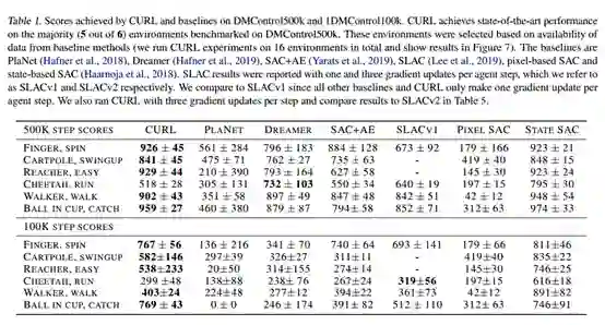 我们提出CURL:用于强化学习的对比无监督表示法。CURL使用表示学习从原始像素中提取高级特征,并在提取的特征上执行off-policy控制。在DeepMind控制套件和Atari游戏中,CURL在复杂任务中的表现优于之前基于像素的方法,无论是基于模型的还是无模型的,在100K环境和交互步骤的基准测试中,分别获得1.9倍和1.6倍的性能提升。在DeepMind控制套件中,CURL是第一个与使用基于状态特征的方法的采样效率和性能接近的基于图像的算法。