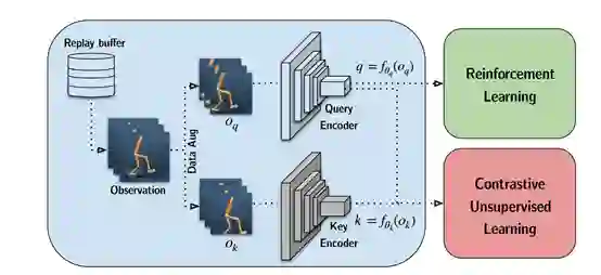 从缓冲区采样一批转换后的观察数据,观察数据被扩充两次以形成query观察值和key观察值,然后分别用query编码器和key编码器对它们进行编码。query被传递给RL算法,而query-key对被传递给表示学习目标。在梯度更新步骤中,只有query编码器被更新,key编码器权重是query权重的moving average (EMA)。如下图所示: