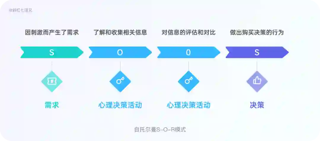 “用户在购买决策的模式”有很多种,最常见的来自托尔曼S-O-R模式所揭示的:用户在受到外部因素的刺激下,产生心理决策活动,从而会作出购买决策的行为。