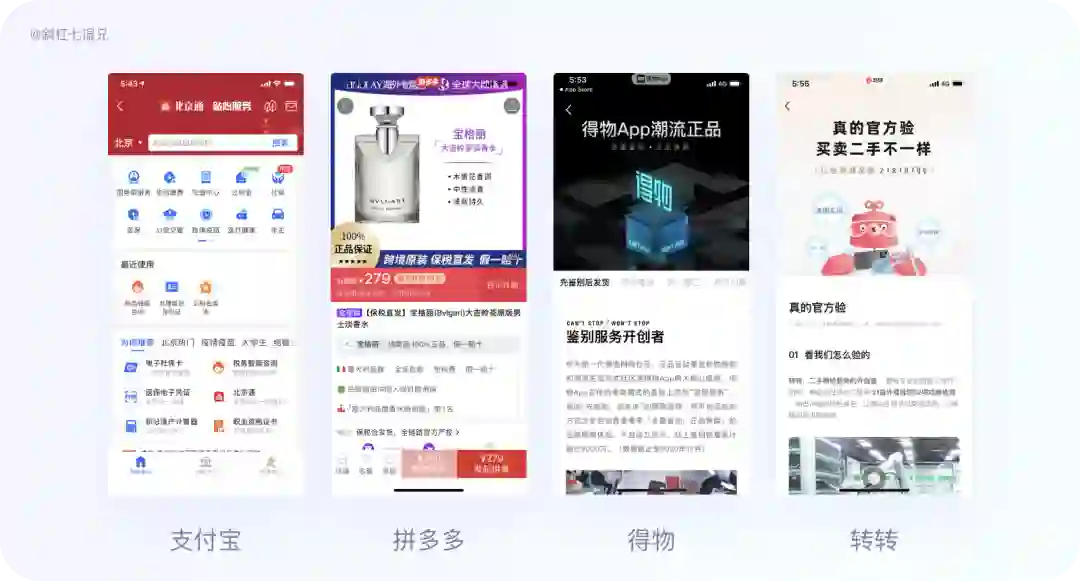 我举几个例子,比如支付宝产品就会以政府做信任背书,比如拼多多、得物、二手转转等电商交易平台会借助权威的机构来和用户建立起信任关系。
