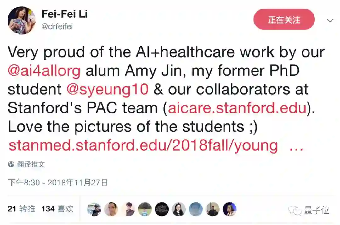 我对这个AI+医护的项目很自豪,作者是我们AI4ALL成员Amy Jin、我以前的博士生Serena Yeung,还有我们斯坦福AI护理团队的同事们,好喜欢这些学生们的照片呀~