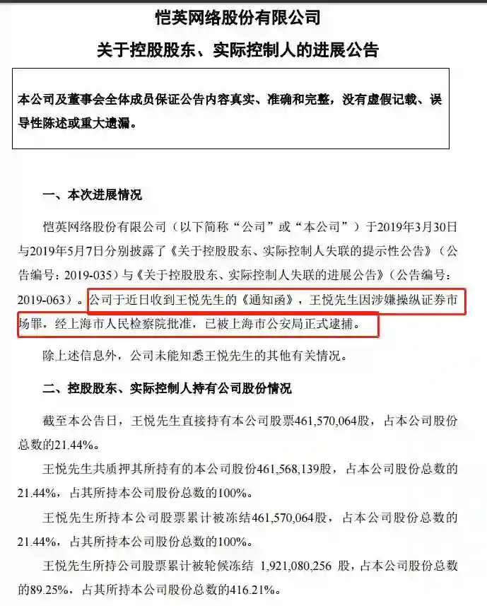 6月12日晚间,恺英网络公告称,该公司实控人叫王悦被正式逮捕了。