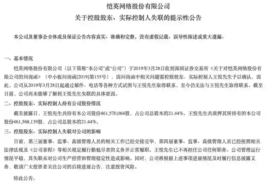 2018年起,王悦逐步从恺英网络淡出,先后卸任总经理、董事长、董事职务,并于今年3月29日失联。