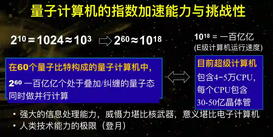 薛院士给大家举了一个简单的例子,经典的计算机只懂0和1,大家都知道2的10次方是1024,也就约等于10的三次方,2的60次方约等于10的18次方。现在最大的超级计算机包含4-5万CPU,每个CPU包含几十亿晶体管。