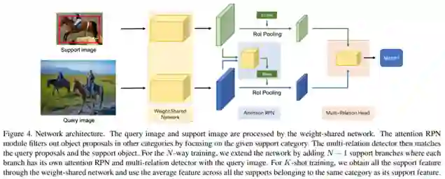 新的网络架构是基于多分支共享权重网络,一个分支是查询,另外一个分支是支持,查询分支的共享权重网络是基于Faster RCNN结构。网络结构图示如下: