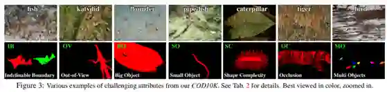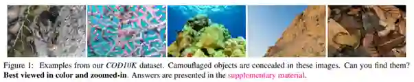 伪装或者周围形似的目标检测一直是目标检测领域最有挑战性的问题,作者在论文中提出了一个新的数据集COD10K,包含一万张自然场景下的伪装对象,总计78个对象类别,图像通过标签、box框、实例分割、Matting级别的标注。
