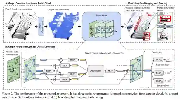 作者提出了一种新的网络模型Point-GNN,实现了对激光雷达数据点云的3D对象检测,网络预测对象类别与形状,作为一阶段网络,实现了自动回归计算机制检测多个对象。网络结构如下图所示: