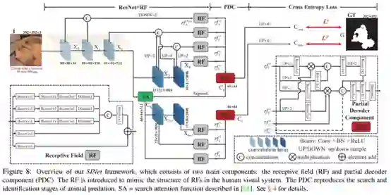 基于这些数据集,作者开发了一个新的伪装对象检测框架SINet(Search Identification Network),网络架构如下: