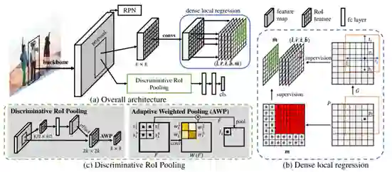 作者提出了一种新两阶段对象检测网络模型D2Det,实现高精度定位与准确分类,采用密集局部回归预测多个密集Boxes从而达到新的Box定位精度。作者提出了一种可判别的ROI池化策略提升了分类准确率。方法基于标准的Faster RCNN网络改进,其中的框迁移回归被替换为新提出的密集局部回归网络。整个网络的模型结构如下: