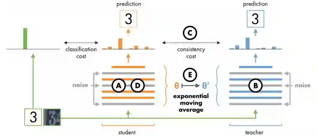 这些方法也非常容易实现和训练。例如,Mean Teacher 包含了以下步骤: