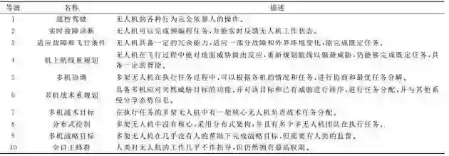 关于无人机自主控制能力划分等级,最早由美国国防部于2001年在《无人机路线2000~ 2025》中提出,根据无人机的自主控制技术能力, 将无人机划分为10个等级。尽管美国的研究机构后来不断从多种角度更新对无人机自主控制能力的描述,但总的来说并没有脱离这10个等级的描述范围。表1列出了这10种等级的描述。在表1的自主控制能力等级划分的基础上, 可以从控制方式角度、类比人类神经网络活动和类比人类智能活动角度,对无人机控制系统的发展作进一步分析。