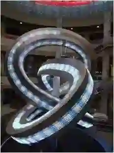 又如,这是中国科技馆的展品之一,叫“三叶扭结”。它是由“莫比乌斯环”演变而成的,是由一条三棱柱带经过三次盘绕,将其中的一端旋转120゚后首尾相接,构成三面连通的单侧单边的三叶扭结造型。三叶扭结虽是立体图形,但只有一个面,即单侧面。这蓝白相间的灯不停地闪烁,乍看是个漂亮的灯饰,但细瞧,它也只有一面和一边,正喻示着科学没有国界,各种科学之间没有边界,科学是相互连通的,科学和艺术也是相互连通的!