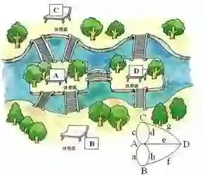 18世纪时在历史名城哥尼斯堡(Königsberg,今俄罗斯加里宁格勒州首府加里宁格勒,也是康德一生没有离开的故土)的一个公园里,有七座桥将普雷格尔河(Pregel)中两个岛及岛与河岸连接起来。当地的市民从事一项非常有趣的消遣活动——在星期六作一次走过所有七座桥的散步,每座桥只能经过一次而且起点与终点必须是同一地点。问是否可能从这四块陆地中任一块出发,恰好通过每座桥一次,再回到起点?这就是著名的“哥尼斯堡七桥问题”。事实上,真要走遍这七座桥的所有走法共有A(7,7)=7!=5040种,一一尝试显然不实际。