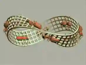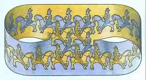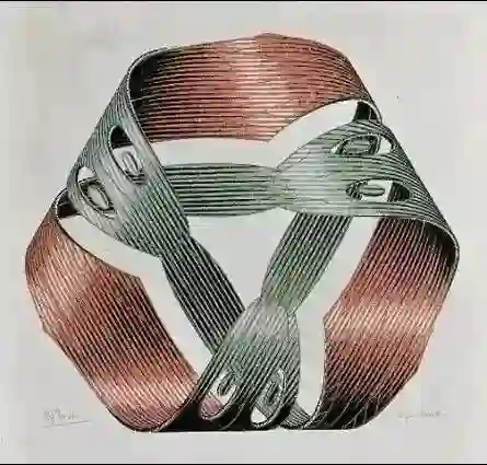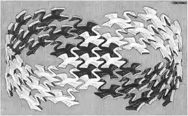 “埃舍尔不仅画各种莫比乌斯环,却并不拘泥于典型的莫比乌斯环。他将其与自己擅长的镶嵌画融合,探索各种可能,达到了形形色色的奇妙效果。”