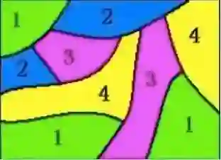 另一个经典的拓扑问题,就是四色问题。与费马问题和哥德巴赫猜想并称为世界三大数学猜想。通俗的说就是:每个平面地图都可以只用四种颜色来染色3,而且没有两个邻接的区域颜色相同。
