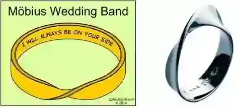 阿琳举起莫比乌斯环说:“老师,您所说的都有两面。可是,我这儿有张只有一面的纸!”话音刚落,那位哲学教授和全班同学都惊奇不已,阿琳自然很得意。从此,……。(懂点拓扑学不仅可以获物理学诺奖,还可以获得美人芳心!)