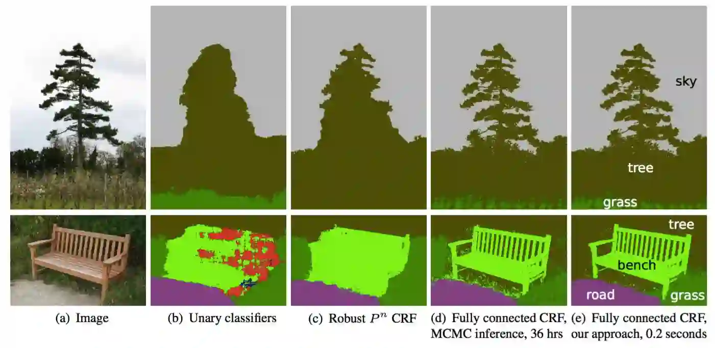 CRF 示意图。(b)一元分类器作为 CRF 的分割输入。(c、d、e)是 CRF 的变体,其中(e)是广泛使用的一种 CRF