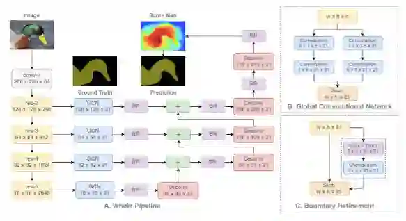 再来看结构,ResNet(没有空洞卷积)构成该结构的编码器部分,而 GCN 和反卷积构成了解码器部分。该结构还采用了一个叫做边界细化(BR)的简单残差块。