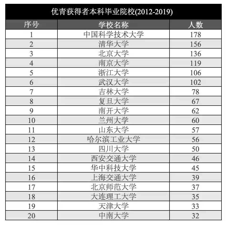 从数据不难看出,优青本科毕业于中国科学技术大学的人数遥遥领先于其他院校,为178人。