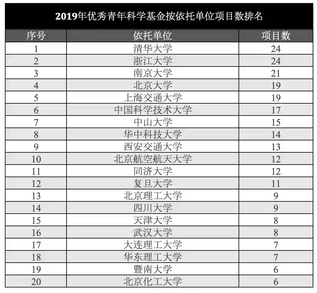 △2019年优秀青年科学基金按依托单位项目数排名(不包含港澳地区),数据来源:科塔学术