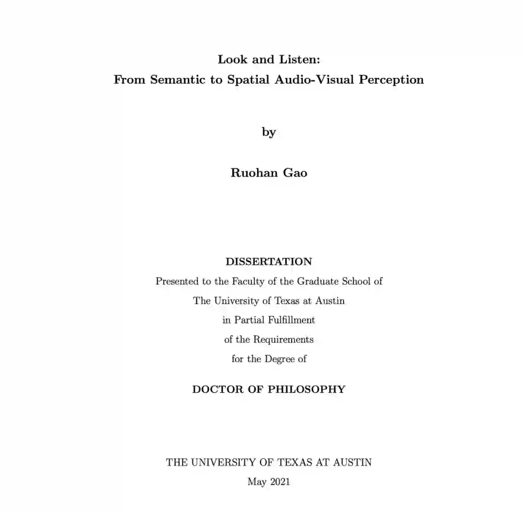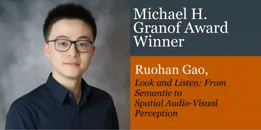 在本年度的评选中,华人学者 Ruohan Gao 的博士学位论文《Look and Listen: From Semantic to Spatial Audio-Visual Perception》获得了 Michael H. Granof 奖。