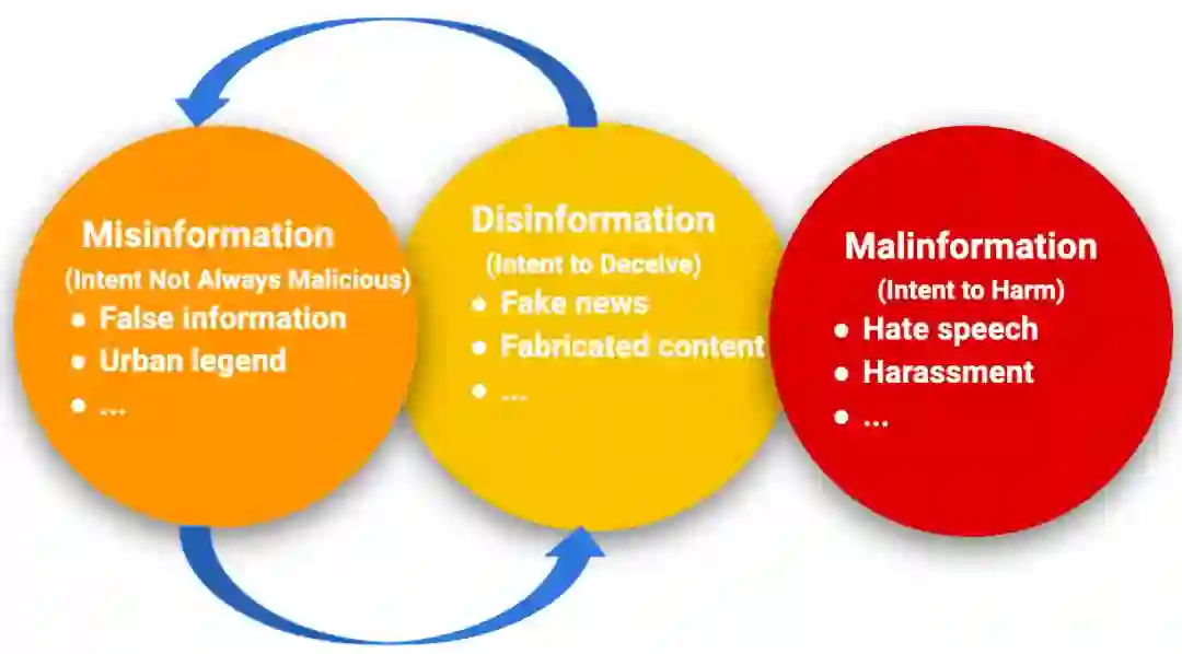 图1: 虚假信息、错误信息和恶意信息之间的关系,以及具有代表性的例子。此外,虚假信息和错误信息可以相互转化。