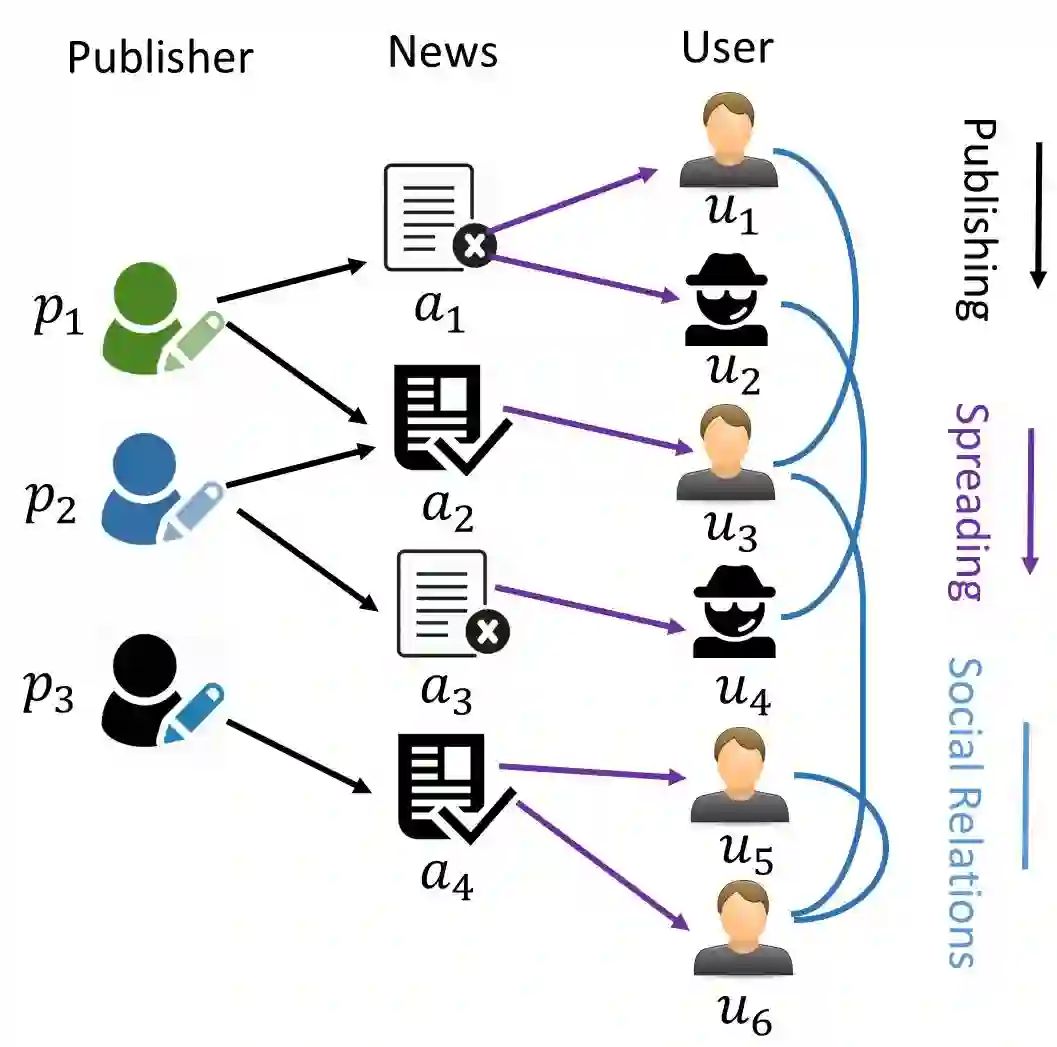 社交媒体已经成为一种流行的信息搜索和新闻消费手段。由于通过社交媒体提供和传播在线新闻的门槛低、速度快,大量的虚假信息如假新闻变得泛滥。在美国,那些故意提供虚假信息的新闻文章是出于各种各样的目的而在网上发布的,其目的从经济利益到政治利益不等。我们以假新闻为例。虚假新闻的广泛传播会对个人和社会产生严重的负面影响。首先,假新闻会影响读者对新闻生态系统的信心。例如,在很多情况下,在2016年美国总统大选期间,最受欢迎的假新闻在Facebook上比主流新闻更受欢迎和广泛传播。其次,假新闻故意说服消费者接受有偏见或错误的信仰,以获取政治或经济利益。例如,2013年,美联社(AP)在推特上发布消息称巴拉克·奥巴马(Barack Obama)受伤,导致1300亿美元的股票价值在短短几分钟内蒸发殆尽。美联社称其推特账户遭到黑客攻击。第三,假新闻改变了人们解读和回应真实新闻的方式,阻碍了他们分辨真假的能力。因此,了解虚假新闻的传播方式,开发有效、准确的假新闻检测和干预的数据挖掘技术,缓解虚假新闻传播的负面影响至关重要。