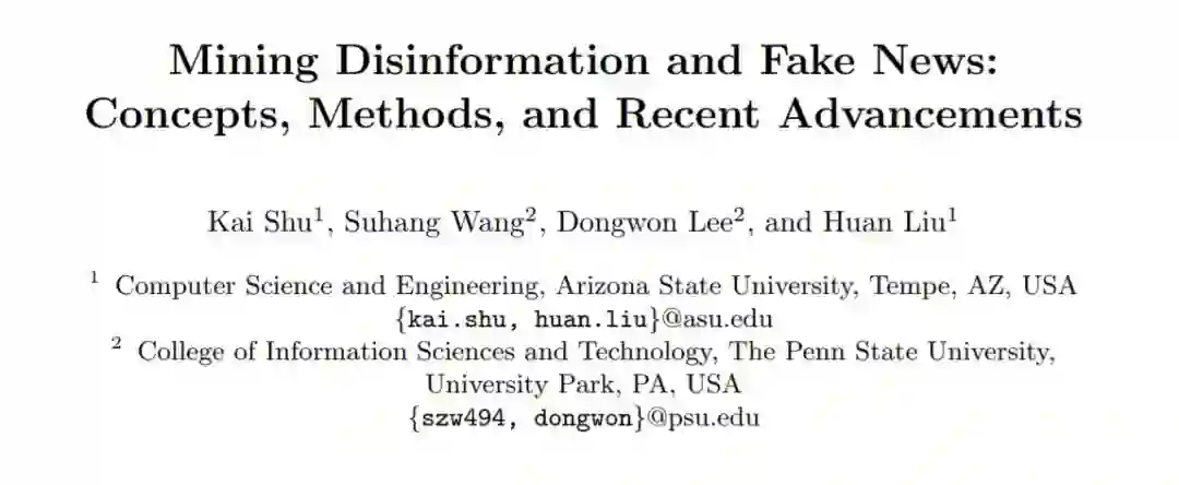 【导读】互联网的发展是一把双刃剑,一方面让人们可以很便捷地获取和分享信息,另一方面也滋生了假信息泛滥,造成很多严重的后果。如何利用人工智能机器学习数据挖掘技术治理缓解虚假信息的影响?是整个研究界关心的话题。最近,亚利桑那州立大学(Arizona State University)的Kai Shu、Huan Liu和宾夕法尼亚州立大学的Suhang Wang和Dongwon Lee共同撰写关于虚假信息和假新闻检测的概述进展《Mining Disinformation and Fake News: Concepts, Methods, and Recent Advancements》,详述了虚假信息、错误信息、恶意信息的概念的方法体系,值得参阅。