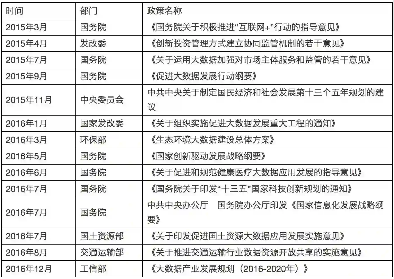 部分部委大数据政策一览表