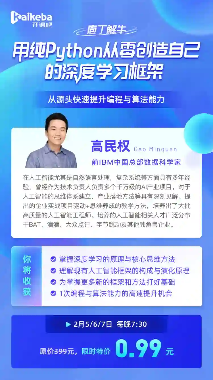 所以,2月5、6、7日,为期3天的训练营《用纯Python从零创造自己的深度学习框架》,即将拯救迷茫的你。