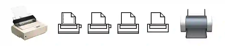 “左边的打印机很显然已经过时了。但是如果拿走纸张上的链轮孔以及旋转它的旋钮,剩下的细节表示的打印机图标可以使用更长时间。”