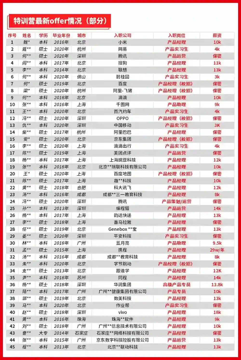 除了文中的李同学之外,特训营还曾帮助许多同学们拿下offer,以下是部分清单: