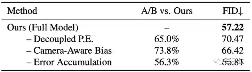 在消融实验上,结果显示该方法在Matterport3D数据集上,相机感知偏差和解耦位置的嵌入,都对提高图像质量和帧与帧之间的一致性有所帮助。