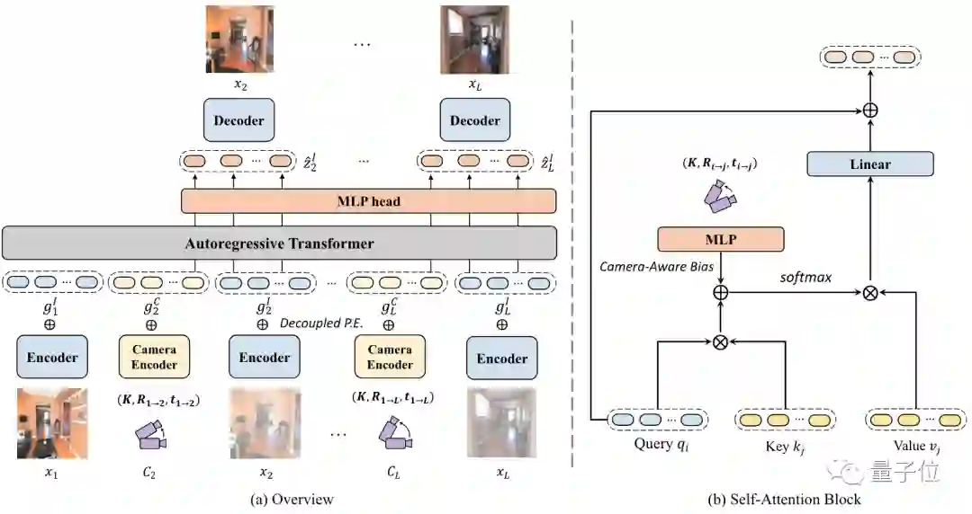 具体训练过程中,要将输入图像和起始相机轨迹位置编码为特定模态的token,同时添加一个解耦的位置输入P.E.。