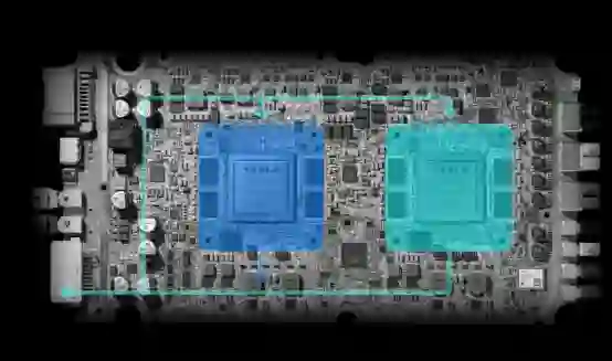 FSD 芯片最显著的特征是适应了自动驾驶对冗余性的要求。FSD 芯片的同一个电路板上,紧挨着布置了两个完全相同的处理模块。做出这一选择需要勇气,因为将芯片一分为二,意味着性能也将受到影响,若放在性能是唯一考核指标的环境中,那么这种方式肯定很难被接受。然而在 AV 系统中,系统具备冗余意味着,一旦其中一个模块出错或者被损坏,软件可及时发现并进行标记,隔离故障模块,而另一模块有独立的供电和存储系统,不受影响可继续承担相应工作。