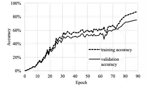 图 4 显示了训练精度与验证精度的对比。从图中可以看出,使用 batch normalization 和 label smoothing 技术,我们的验证精度结果并没有过拟合。