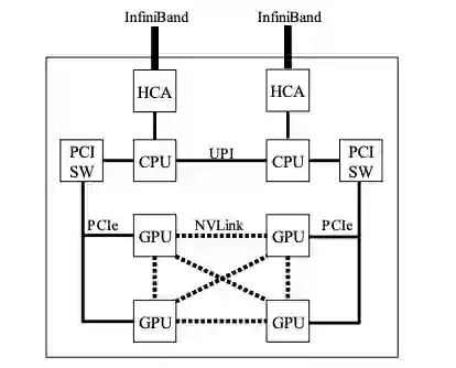 图 1:ABCI 集群中一个计算节点的示意图。它由两个 GPU、四个 GPU 和两个连接到相应 CPU 的 HCA 组成。