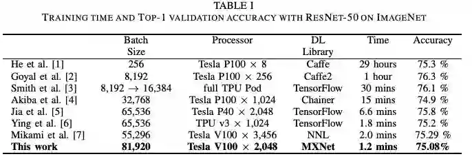 我们开发了一种新的技术,可以在大规模 GPU 集群上使用 large mini-batch,而不会降低验证精度。我们将该技术应用到基于 MXNet 的深度学习框架中。使用 81920 minibatch size,我们的 DNN 训练结果在 74.7 秒内训练完 ResNet-50,验证精度达到 75.08%。